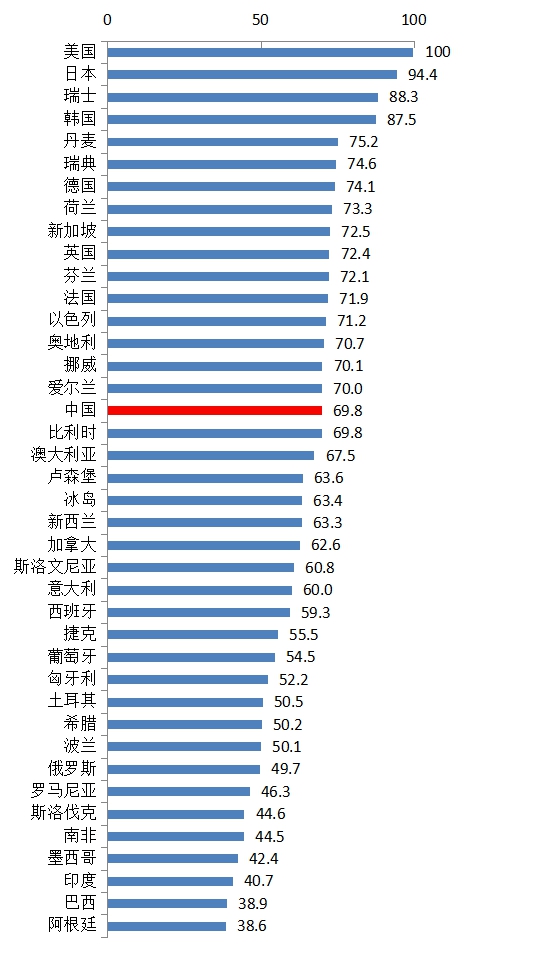 從具體得分看,中國(guó)國(guó)家創(chuàng)新指數(shù)達(dá)到69.8分,比上年提高了1.2分,與英國(guó)、法國(guó)、以色列等排名10-15位國(guó)家間的差距進(jìn)一步縮小,從上年落后0.8-4.1分減小到0.3-2.6分。目前,中國(guó)與排在第16位的愛(ài)爾蘭相比,僅存在0.2分的微弱差距。從國(guó)家創(chuàng)新指數(shù)得分及排名變化趨勢(shì)看,中國(guó)創(chuàng)新能力提升前景仍十分樂(lè)觀。