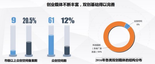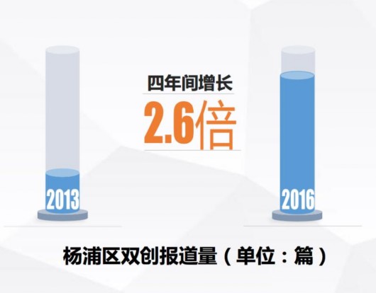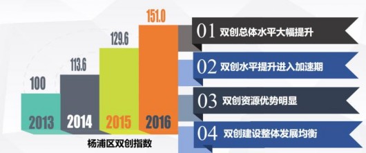 經(jīng)過(guò)指標(biāo)測(cè)算顯示,以2013年作為基期,楊浦區(qū)“雙創(chuàng)指數(shù)”從2013年的100(基期賦值)上升至2016年的151.0,增幅高達(dá)51%。其中,2016年較上年增長(zhǎng)16.5%,成為歷年增速增長(zhǎng)高的一年,雙創(chuàng)發(fā)展增速逐年提升。此外,各分項(xiàng)指數(shù)也均有提高,其中以雙創(chuàng)影響指數(shù)增長(zhǎng)為強(qiáng)勁,從2013年的100增長(zhǎng)到了2016年的153.1,較上年增長(zhǎng)22.8%。“雙創(chuàng)影響力和成果的增幅比要素和環(huán)境明顯,這也表明,創(chuàng)新的要素和環(huán)境需要長(zhǎng)時(shí)間的投入來(lái)改善,創(chuàng)新創(chuàng)業(yè)的發(fā)展需要積極進(jìn)取,還需要厚積薄發(fā)、沉得住氣。”楊浦區(qū)發(fā)改委張?zhí)鞜槺硎。?bào)告顯示,近年來(lái)?xiàng)钇謪^(qū)各類(lèi)雙創(chuàng)載體面積(含老廠房改造)持續(xù)擴(kuò)大,截至2016年,楊浦區(qū)各類(lèi)雙創(chuàng)載體面積已達(dá)到162.3萬(wàn)平方米,其中,科技園區(qū)(含老廠房改造)面積占據(jù)各類(lèi)雙創(chuàng)載體總面積的94.3%。同時(shí),如長(zhǎng)陽(yáng)創(chuàng)谷等園區(qū)的品牌效應(yīng)逐漸形成和擴(kuò)散,服務(wù)能級(jí)不斷提升。與此同時(shí),市級(jí)以上眾創(chuàng)空間備案數(shù)占上海比例呈逐年上升態(tài)勢(shì)。至2016年,楊浦已初步建成各類(lèi)“眾創(chuàng)空間”61家,約占上海市總量的12%。其中,國(guó)家級(jí)眾創(chuàng)空間授牌為9家,占全市的20.5%;市級(jí)眾創(chuàng)空間授牌為16家,占全市的14%。