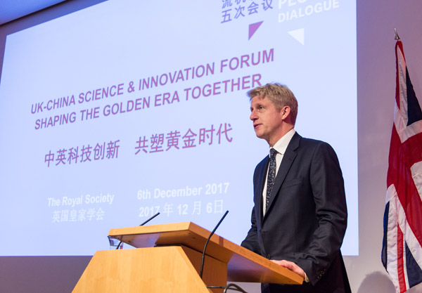 2017年12月6日,中國(guó)科學(xué)技術(shù)部與英國(guó)商業(yè)、能源和產(chǎn)業(yè)戰(zhàn)略部在英國(guó)皇家學(xué)會(huì)共同舉辦“中英科技創(chuàng)新合作:共塑黃金時(shí)代”論壇,該活動(dòng)是中英高級(jí)別人文交流機(jī)制第五次會(huì)議的重要活動(dòng)之一。國(guó)務(wù)院副總理劉延?xùn)|、科技部黨組書(shū)記、副部長(zhǎng)王志剛與英國(guó)約克公爵安德魯王子、英國(guó)大學(xué)、科學(xué)、研究與創(chuàng)新國(guó)務(wù)大臣喬·約翰遜(Jo Johnson)等出席論壇致辭并參觀了中英科技創(chuàng)新成果展。