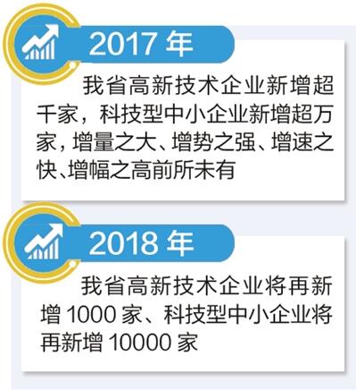 2018年我省高新技術(shù)企業(yè)和科技型中小企業(yè)將分別再新增1000家、10000家。記者從2月5日召開的全省科技工作會議上獲悉,到今年底,我省高新技術(shù)企業(yè)將超過4000家,科技型中小企業(yè)將達到62000家。