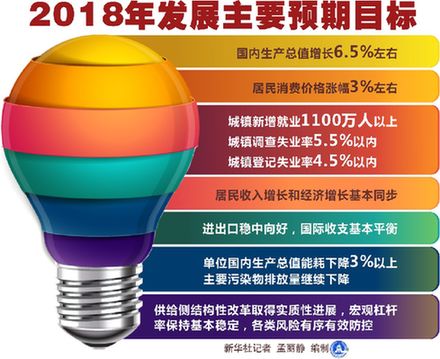 政府工作報告提出,今年發(fā)展主要預期目標是:國內生產總值增長6.5%左右;居民消費價格漲幅3%左右;城鎮(zhèn)新增就業(yè)1100萬人以上,城鎮(zhèn)調查失業(yè)率5.5%以內,城鎮(zhèn)登記失業(yè)率4.5%以內;居民收入增長和經濟增長基本同步;進出口穩(wěn)中向好,國際收支基本平衡;單位國內生產總值能耗下降3%以上,主要污染物排放量繼續(xù)下降;供給側結構性改革取得實質性進展,宏觀杠桿率保持基本穩(wěn)定,各類風險有序有效防控。