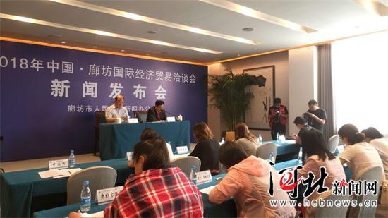5月14日上午,2018年中國(guó)·廊坊國(guó)際經(jīng)濟(jì)貿(mào)易洽談會(huì)召開第二次新聞發(fā)布會(huì)。圖為會(huì)議現(xiàn)場(chǎng)。通訊員李松潔攝
