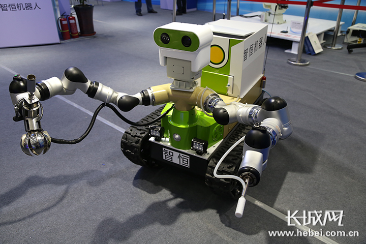 2018年“5·18”經(jīng)洽會(huì)大智移云展上的環(huán)保應(yīng)急偵測(cè)特種機(jī)器人。記者周亞彬攝