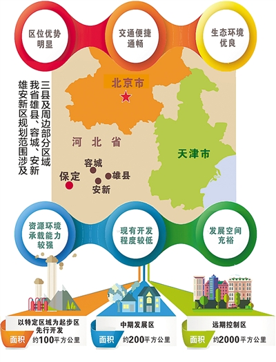 雄安新區(qū)規(guī)劃范圍涉及河北省雄縣、容城、安新3縣及周邊部分區(qū)域,地處北京、天津、保定腹地,區(qū)位優(yōu)勢明顯、交通便捷通暢、生態(tài)環(huán)境優(yōu)良、資源環(huán)境承載能力較強,現(xiàn)有開發(fā)程度較低,發(fā)展空間充裕,具備高起點高標準開發(fā)建設的基本條件。雄安新區(qū)規(guī)劃建設以特定區(qū)域為起步區(qū)先行開發(fā),起步區(qū)面積約100平方公里,中期發(fā)展區(qū)面積約200平方公里,遠期控制區(qū)面積約2000平方公里。