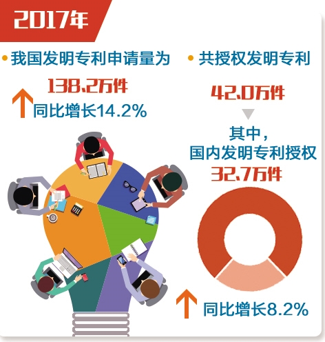 近日,國(guó)家知識(shí)產(chǎn)權(quán)局發(fā)布了2017年我國(guó)發(fā)明專(zhuān)利有關(guān)情況和企業(yè)排名。數(shù)據(jù)顯示,2017年,我國(guó)發(fā)明專(zhuān)利申請(qǐng)量為138.2萬(wàn)件,同比增長(zhǎng)14.2%。共授權(quán)發(fā)明專(zhuān)利42.0萬(wàn)件,其中,國(guó)內(nèi)發(fā)明專(zhuān)利授權(quán)32.7萬(wàn)件,同比增長(zhǎng)8.2%。專(zhuān)利事業(yè)迸發(fā)出量質(zhì)齊升的澎湃動(dòng)力,從知識(shí)產(chǎn)權(quán)大國(guó)邁向知識(shí)產(chǎn)權(quán)強(qiáng)國(guó)的步伐更加堅(jiān)實(shí)有力。