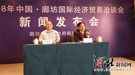 5月14日上午,2018年中國(guó)·廊坊國(guó)際經(jīng)濟(jì)貿(mào)易洽談會(huì)召開第二次新聞發(fā)布會(huì)。圖為會(huì)議現(xiàn)場(chǎng)。通訊員李松潔攝